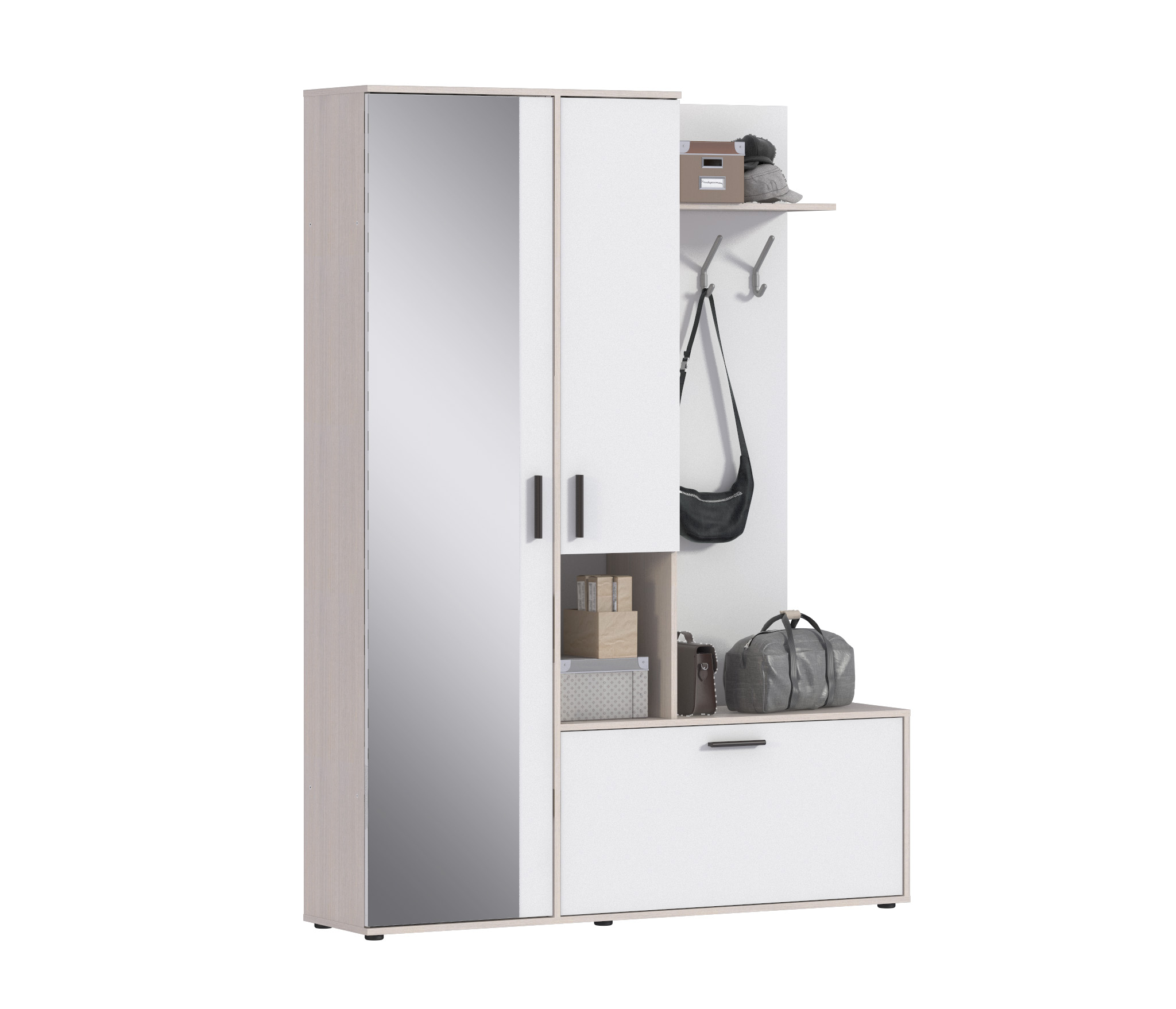 Прихожая «Саша» - компактная и функциональная мебель, которая будет вас встречать и провожать каждый день. Вместительный шкаф для одежды вмещает 10 вешалок, тумба под коробки и мелочь с 4-мя полками, обувной отдел для 18 пар обуви, и важная деталь - зеркало, которое позволяет разглядеть себя в полный рост.