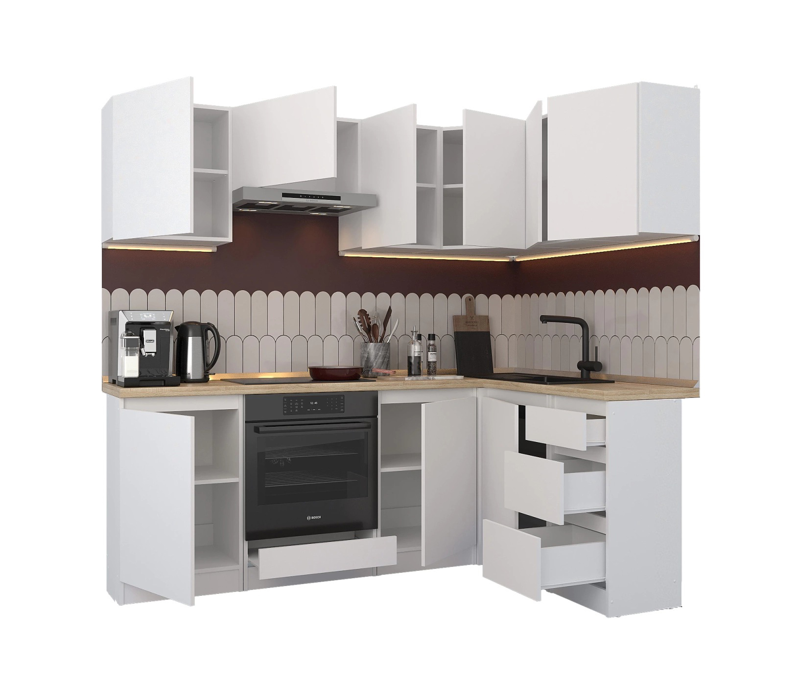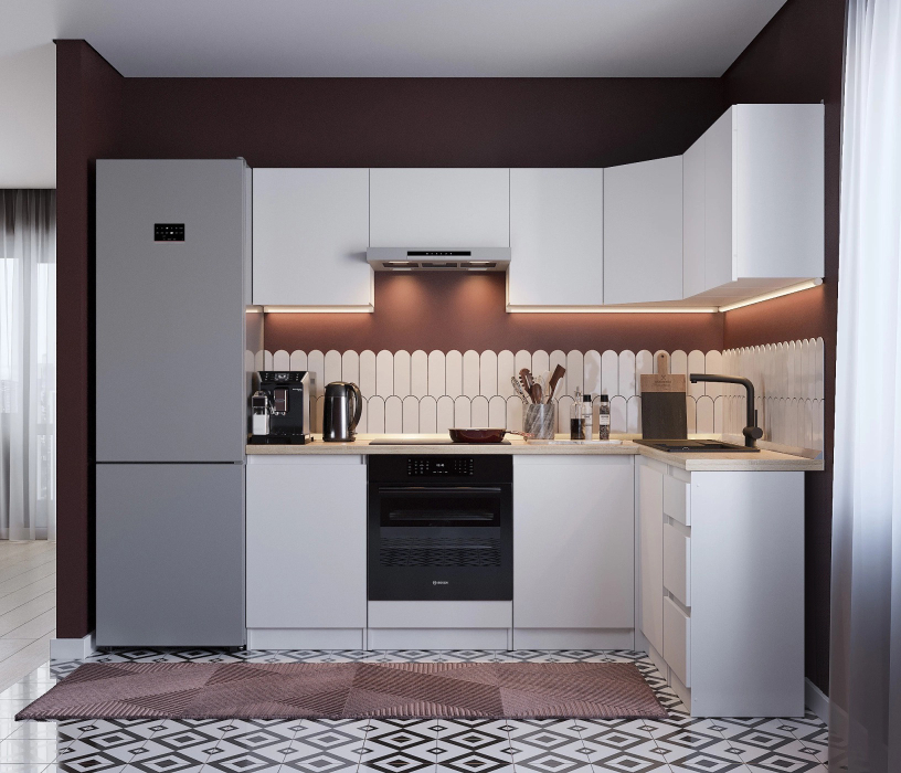 Кухня Леон сочетает в себе функциональность, стиль и доступность, и является прекрасным выбором для тех, кто ищет компактное и удобное решение для своей кухни. Кухонный гарнитур Леон идеально подходит для помещений с ограниченным пространством. Корпус и фасады выполнены из белого ЛДСП. Фасады столов и шкафов не имеют лицевой фурнитуры и открываются захватом за тыльный край фасада. Леон смотрится современно, а отсутствие ручек упрощает уход за поверхностью.