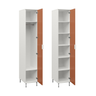 Конструкция с глухой распашной дверцей. Внутри шкаф оборудован полками или штангой.