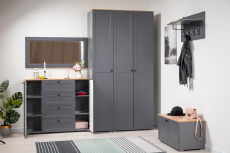 Вместительная шкафная группа позволит оптимально организовать хранение, а продуманные габариты тумбы, комода и зеркала дают возможность собрать различные компоновки.