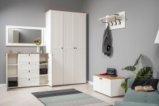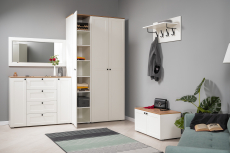 Вместительная шкафная группа позволит оптимально организовать хранение, а продуманные габариты тумбы, комода и зеркала дают возможность собрать различные компоновки.