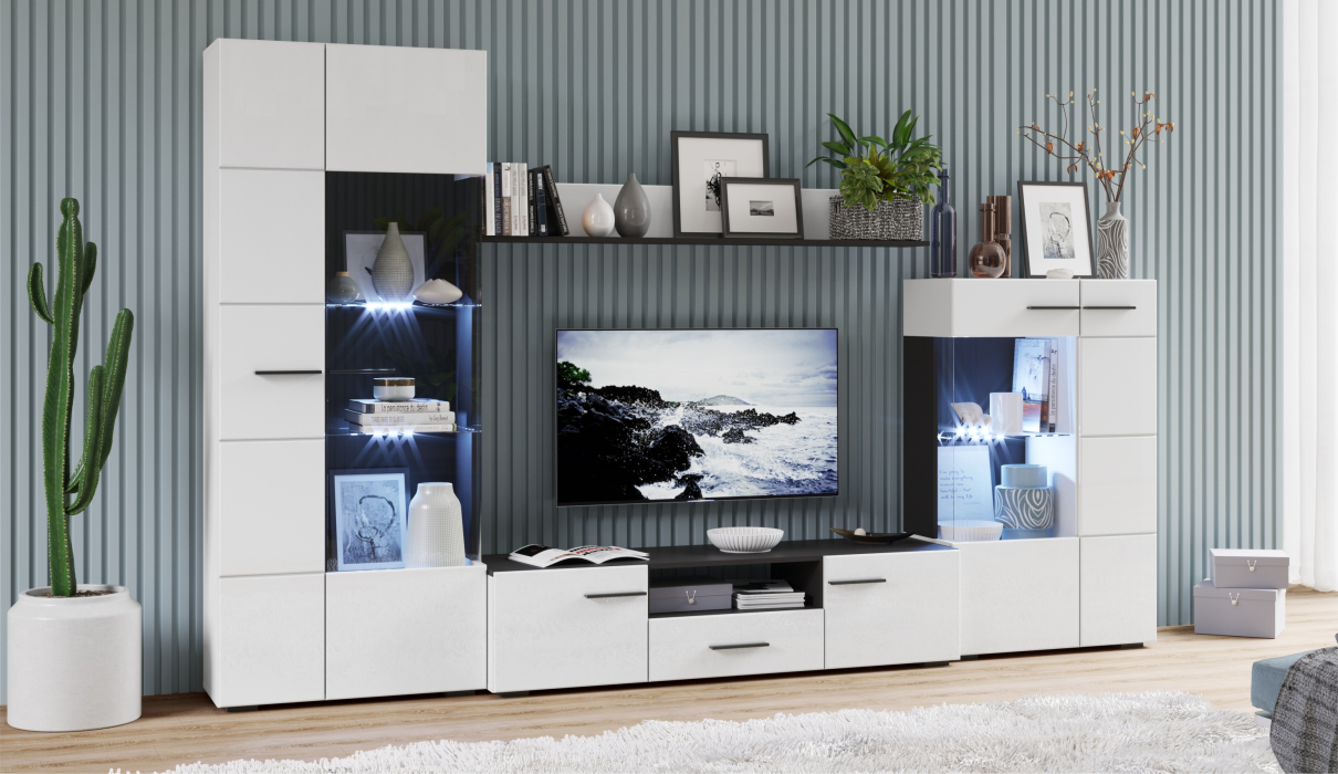 Современная стенка Невада – яркий представитель стиля минимализма, отличается высокой функциональностью и эстетичным внешним видом. Глянцевые белые фасады из МДФ и прозрачные витрины из закаленного стекла создают легкость и воздушность, а эффект блеска и отражения зрительно увеличивает пространство комнаты, добавляет света. Комбинированный контрастный корпус, ручки и задняя стенка черного цвета подчеркивают строгую геометрию линий и форм. Светодиодная подсветка делает акцент на дорогих для Вас вещах, таких как фото, статуэтки или посуда. Мебель выполнена из экологически безопасных и надежных материалов.