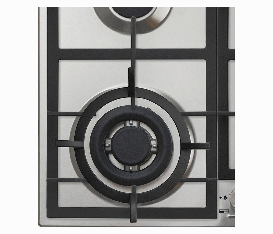 Газовая варочная панель 60см, 4 высокоэффективные конфорки, WOK- сверхмощная конфорка с тройным рядом пламени, автоматический электроподжиг, газ-контроль каждой конфорки, передние металлические переключатели, чугунные решетки, цвет- нерж