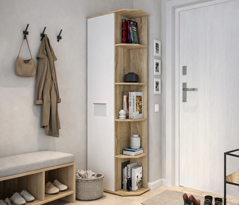 Габаритные размеры шкафа – ширина 55 см, высота 191 см и глубина 35 см. Визуально его можно разделить на два отделения. Одно угловое с пятью открытыми полками. Другое оснащено вместительными полками и имеет две дверцы. Произведен шкаф из современного и прочного КДСП. Классическое исполнение, светлый оттенок оформления «Дуб Сонома», подобранная фурнитура и качественные крепёжные механизмы говорят о достойном качестве торцевого шкафа Мамбо СБ-2754.