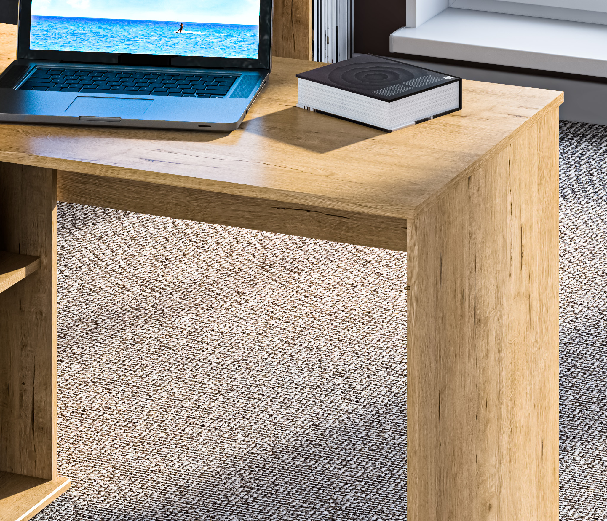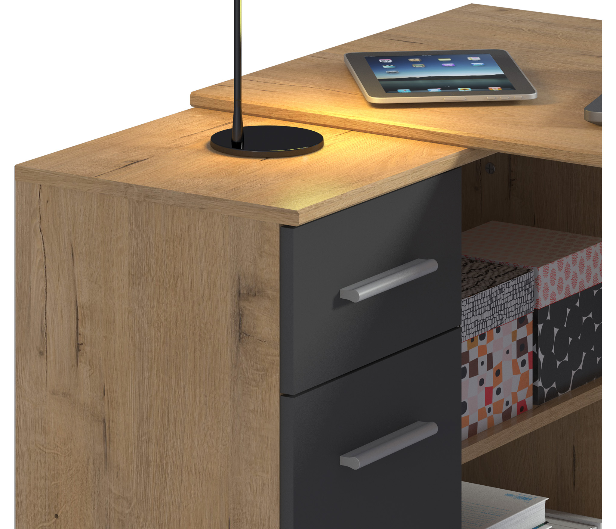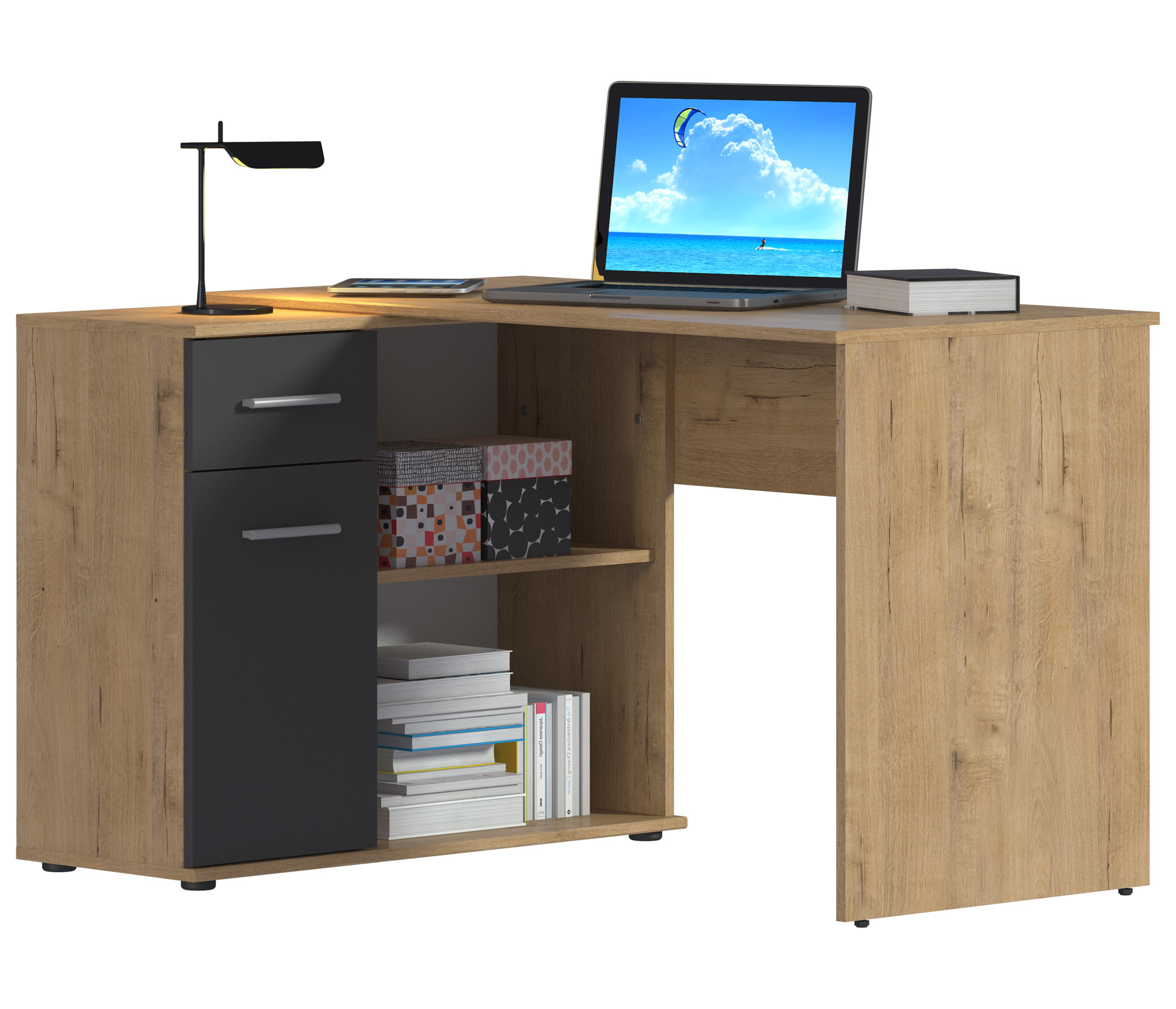Стол-тумба Мамбо СБ-2886 – продуманное и комфортное рабочее место. Идеальный вариант, если есть необходимость в двух письменных столах. Простая конструкция, светлый оттенок, лаконичный угловой дизайн позволяют без проблем разместить стол-тумбу Мамбо в детской, комнате школьника или студента, а также в кабинете. Габаритные размеры – ширина 119 см, высота 74 см и глубина 91 см. Под рабочей поверхностью расположена тумба с открытыми вместительными полками, а также выдвижной ящик и закрытое отделение с отдельной дверцей. Стол произведен из современного экологичного КДСП. Корпус и рабочая поверхность выполнены в цвете «Дуб Сонома», фасадные поверхности в Белом цвете. Возможен как левый, так и правый вариант сборки.