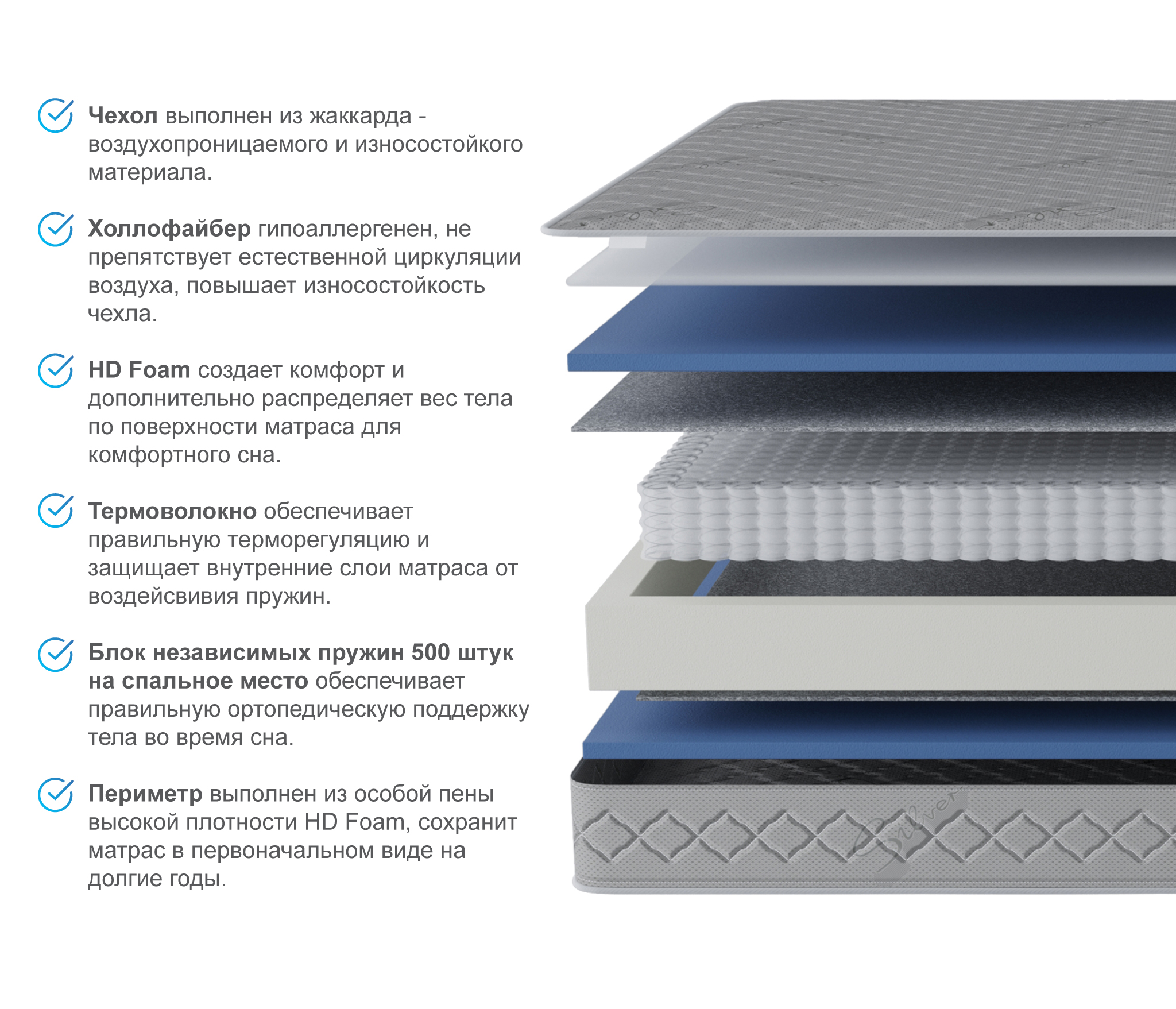 Каждый элемент наполнения матраса по недорогой цене направлен на то, чтобы сделать отдых пользователя здоровым и максимально приятным. Состав включает: