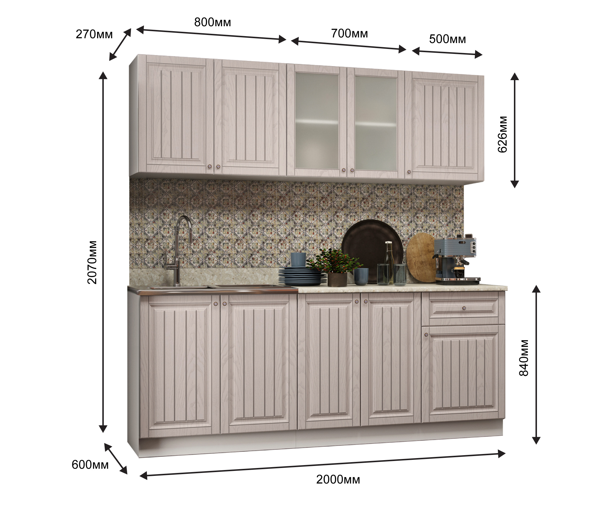 два верхних шкафа - общая ширина 1200мм (500мм , 700мм со стеклом) и на 800мм. Высота 626мм. Глубина 270 мм.