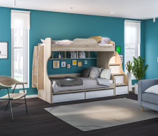 Кровать из детского гарнитура «Мамбо» – симпатичная и комфортабельная модель, воспользоваться которой могут даже взрослые члены семьи. Занимая не так уж и много места, она выделяется своей функциональной значимостью. Три в одном. Днем это вполне приличный диванчик, ночью полноценное спальное место шириной 95 см, к тому же, это и система хранения постельных принадлежностей, так как модель оборудована двумя объемными выдвигающимися ящиками. Кровать собрана из мебельных щитов повышенной прочности с износостойким поверхностным покрытием приятного пастельного оттенка «Дуб Сонома». Ящики и фасады к ним изготовлены из ДСП песочного цвета. Неброское сочетание цветов вносит в интерьер гармонию и умиротворение, что бывает нелишним, когда требуется успокоить разыгравшегося ребенка.