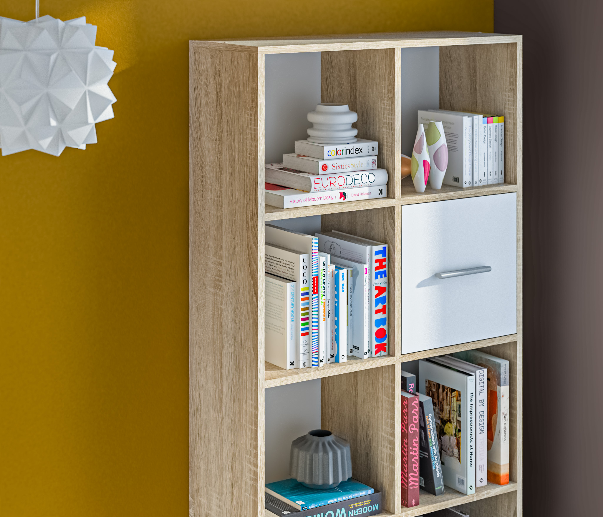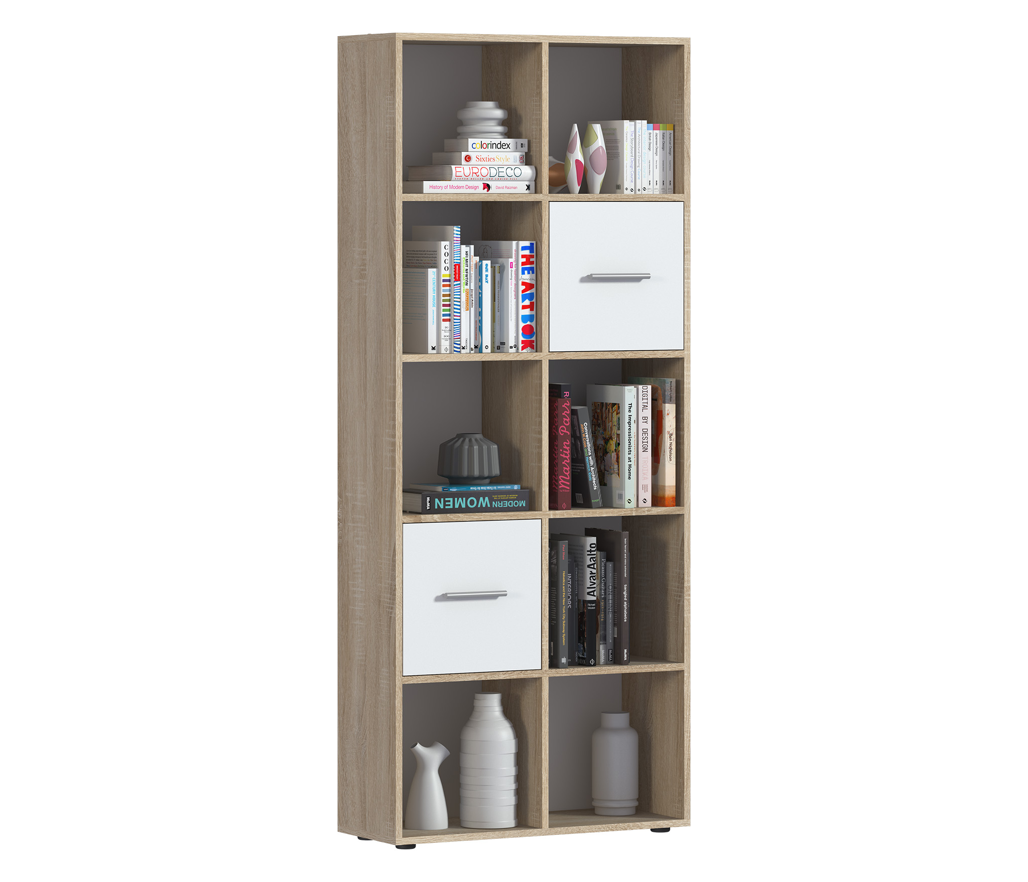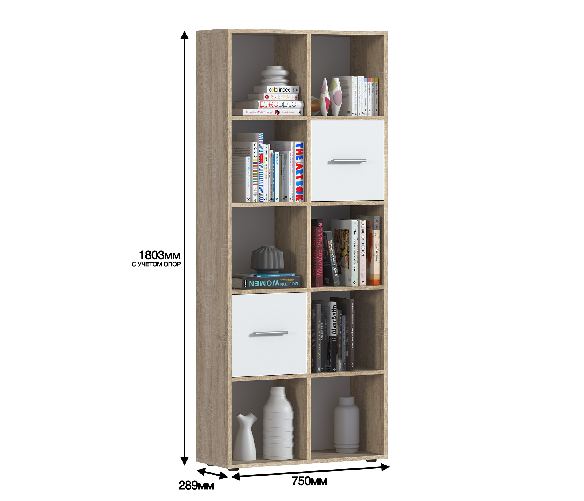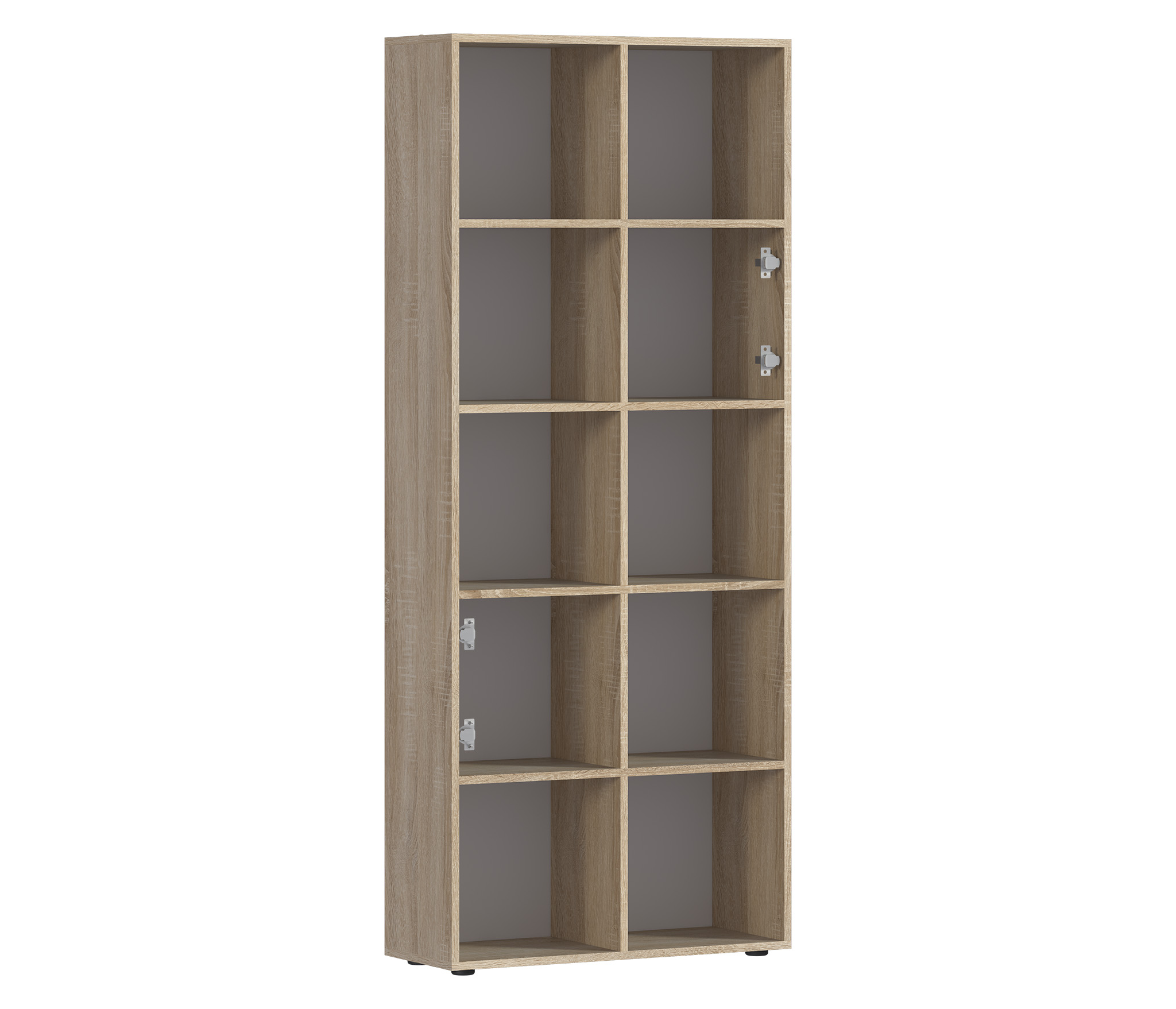 Стеллаж Мамбо СБ-3215 – это практичное решение вопроса, связанного с хранением целого ряда вещей – книг, журналов, посуды, памятных сувениров, предметов для рукоделия и т.д. Он может быть элементом модульной системы Мамбо, а может рассматриваться как автономный предмет мебели. Габаритные размеры – ширина 75 см, высота 180 см, глубина 28 см. Визуально стеллаж разделен на десять одинаковых отделений. Два отделения оснащены непрозрачными дверцами, остальные – открытые. Модель производится из современного материала КДСП. Отделка комбинированная – корпус в цвете «Дуб Сонома», фасадные поверхности белые.