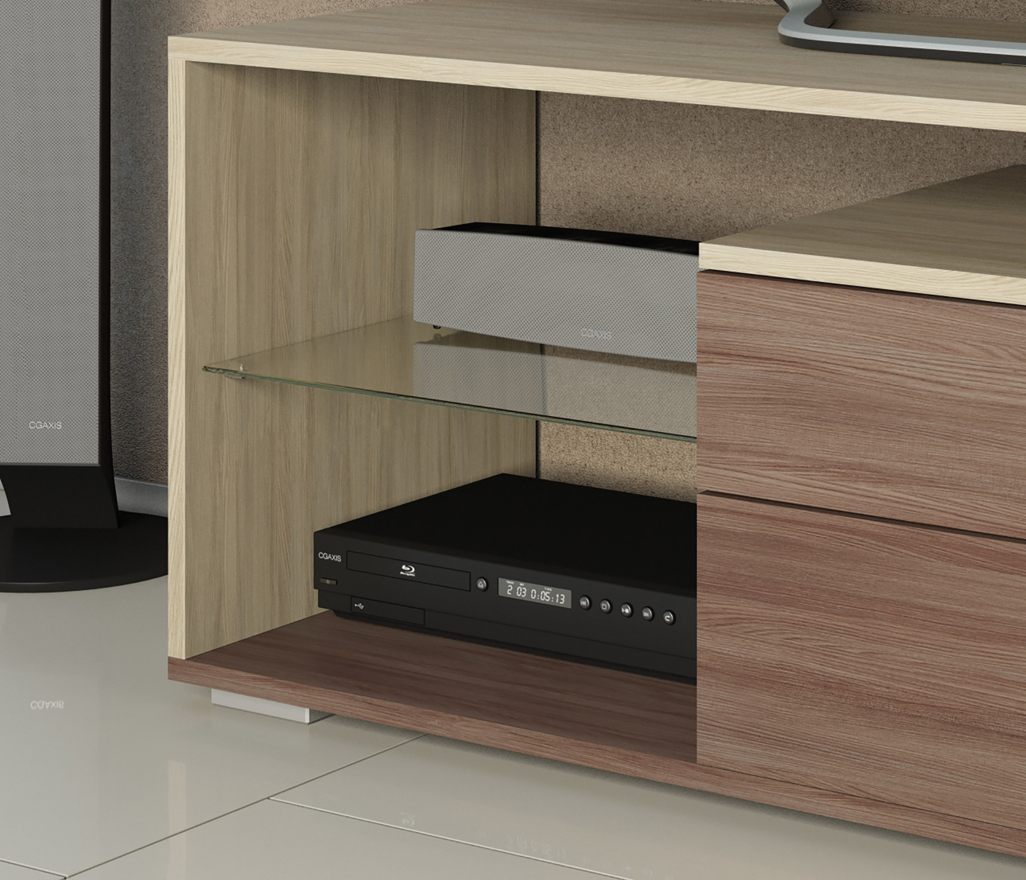 Большая ТВ-тумба имеет широкую столешницу, которая подходит для телевизора практически любой диагонали. Открытые полочки подойдут для игровых приставок или видеоплееров, а два вместительных ящика позволят разместить сопутствующие аксессуары.