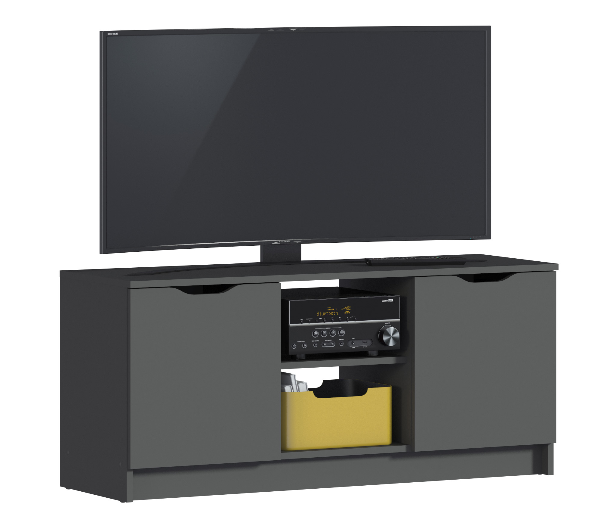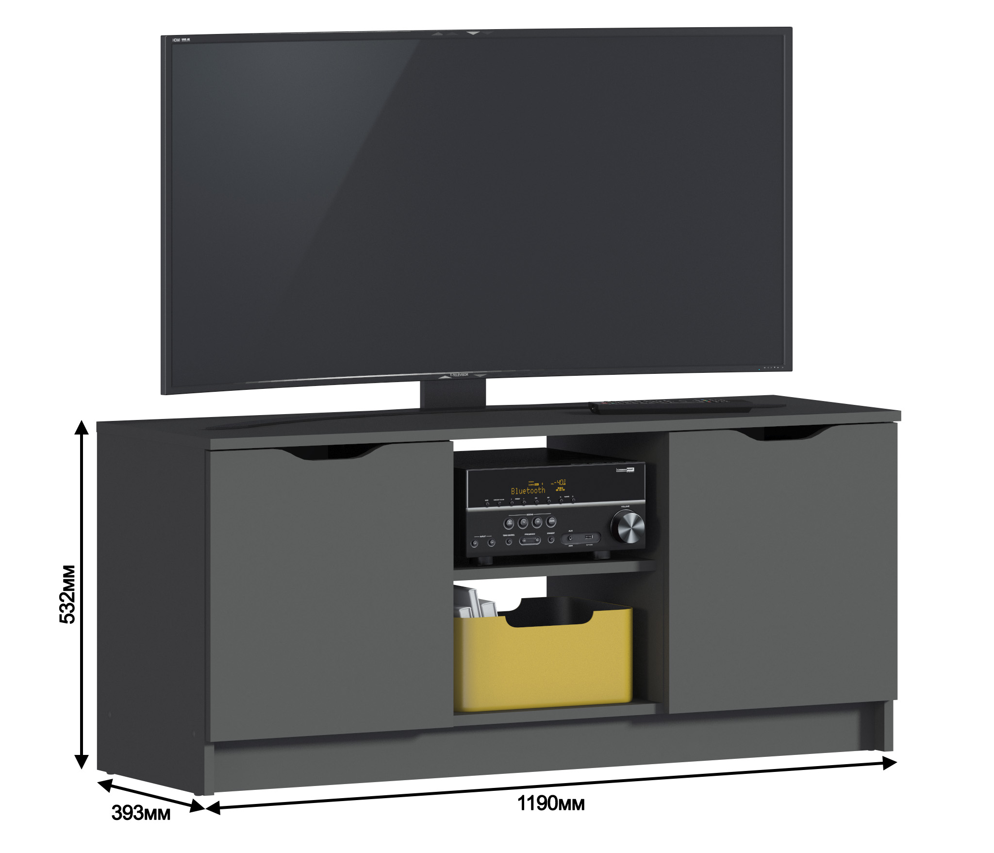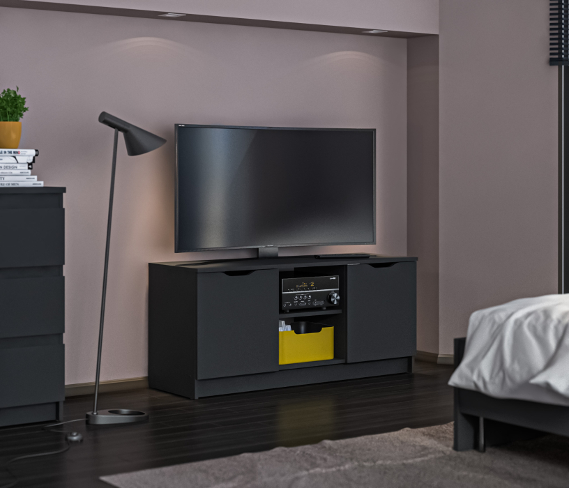 Габаритные размеры – ширина 119, высота 53 см и глубина 39 см. Вес тумбы 24,42 кг, что даёт возможность передвигать её по усмотрению. Визуально тумбу можно разделить на три отделения – открытое центральное с двумя полками для аудио или видео системы и два вместительных отделения с дверцами. Тумба выполнена в минималистичном дизайне из прочного современного материала ЛДСП.