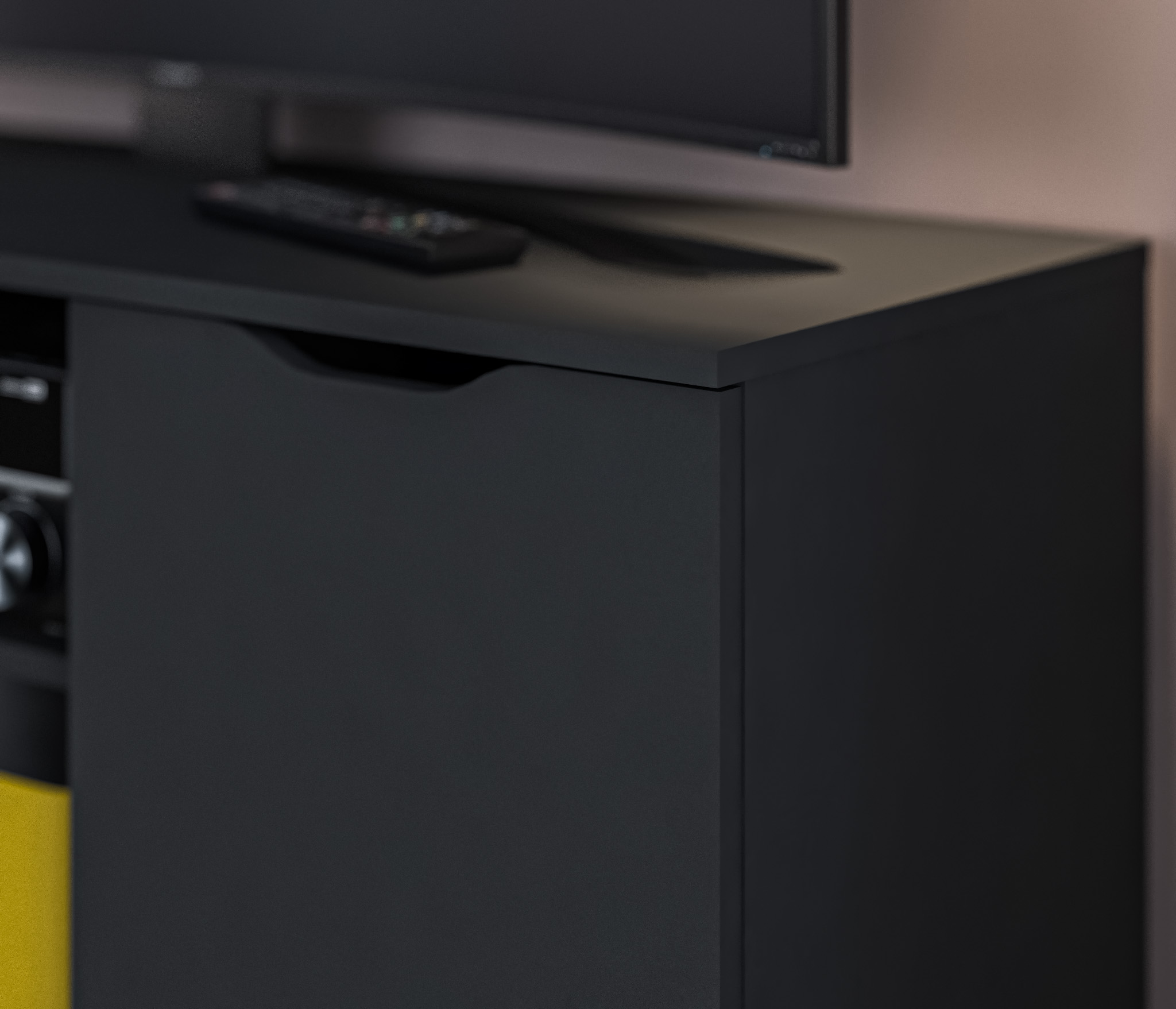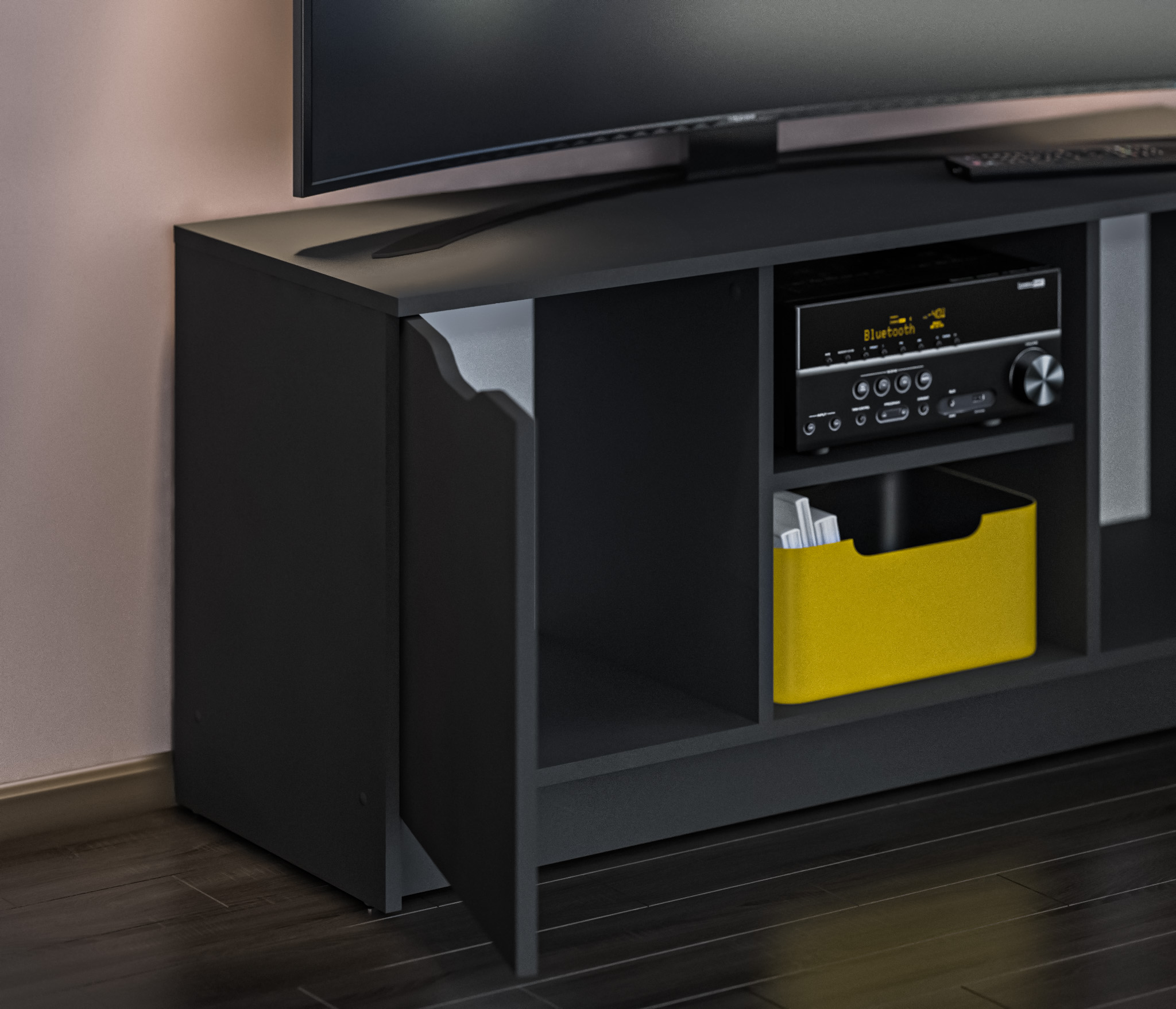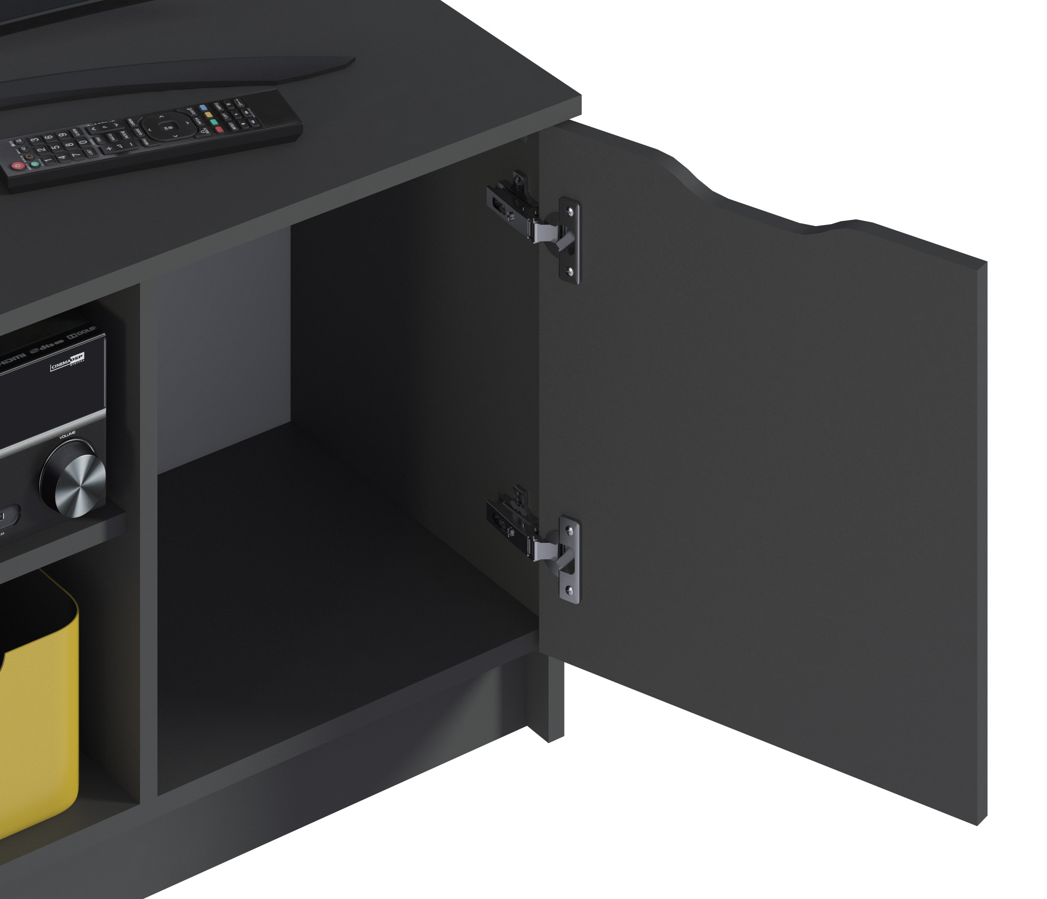 Габаритные размеры – ширина 119, высота 53 см и глубина 39 см. Вес тумбы 24,42 кг, что даёт возможность передвигать её по усмотрению. Визуально тумбу можно разделить на три отделения – открытое центральное с двумя полками для аудио или видео системы и два вместительных отделения с дверцами. Тумба выполнена в минималистичном дизайне из прочного современного материала ЛДСП.