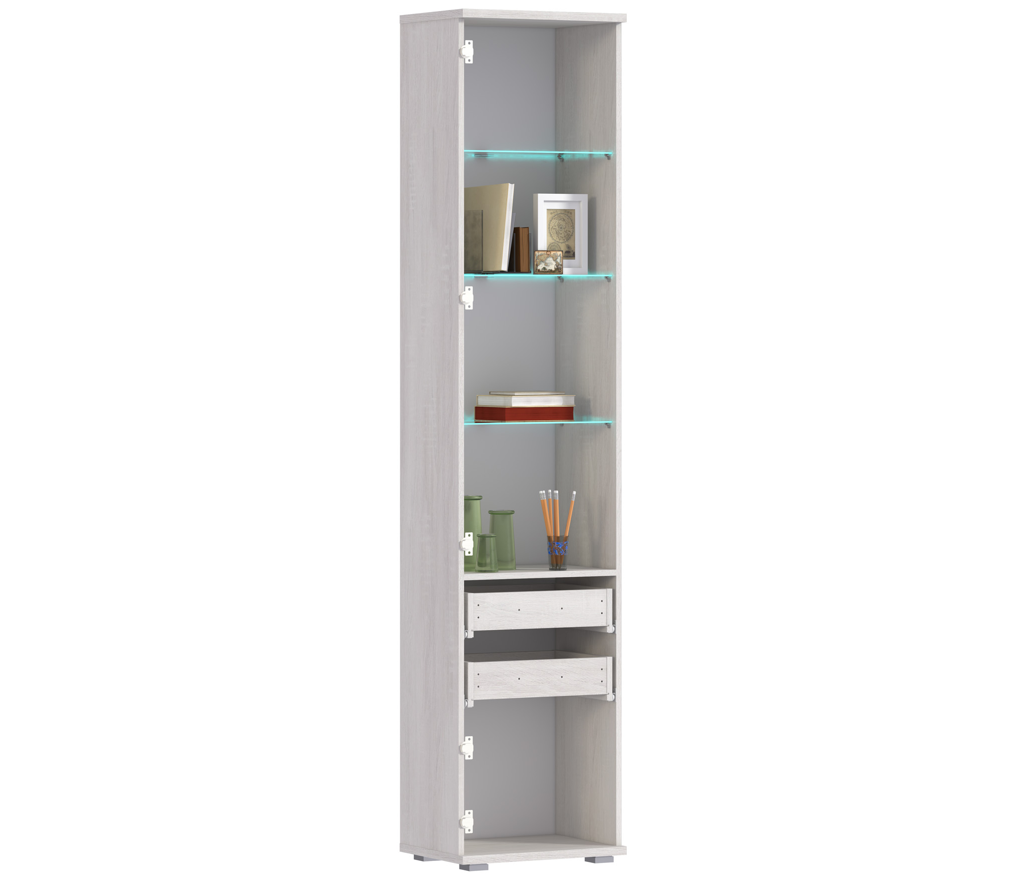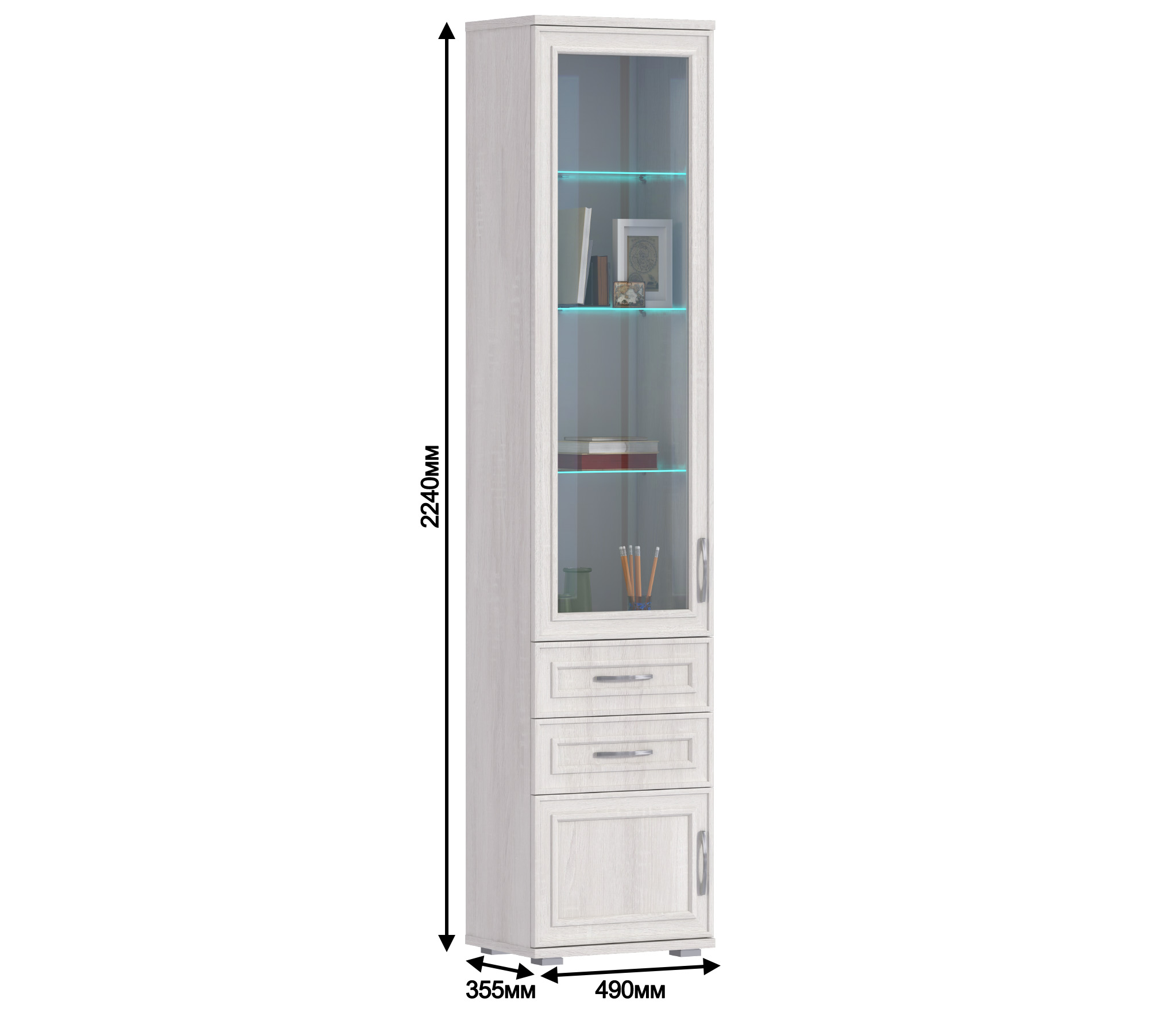 Габаритные размеры витрины – ширина 49 см, высота 224 см и глубина 35 см. Верхнее отделение за стеклянной дверцей оснащено тремя стеклянными полками, в нижней части витрины располагается вместительная тумба. Шкаф оснащен двумя выдвижными ящиками для хранения мелочей. Произведен шкаф из современных материалов - КДСП и МДФ.Классическое исполнение, светлый оттенок оформления «Дуб Сонома белый», подобранная фурнитура и качественные крепёжные механизмы говорят о достойном качестве витрины Флоренция СБ-2398.Шкаф может использоваться как отдельный предмет мебели, так и в сочетании с другими элементами из коллекции Флоренция.