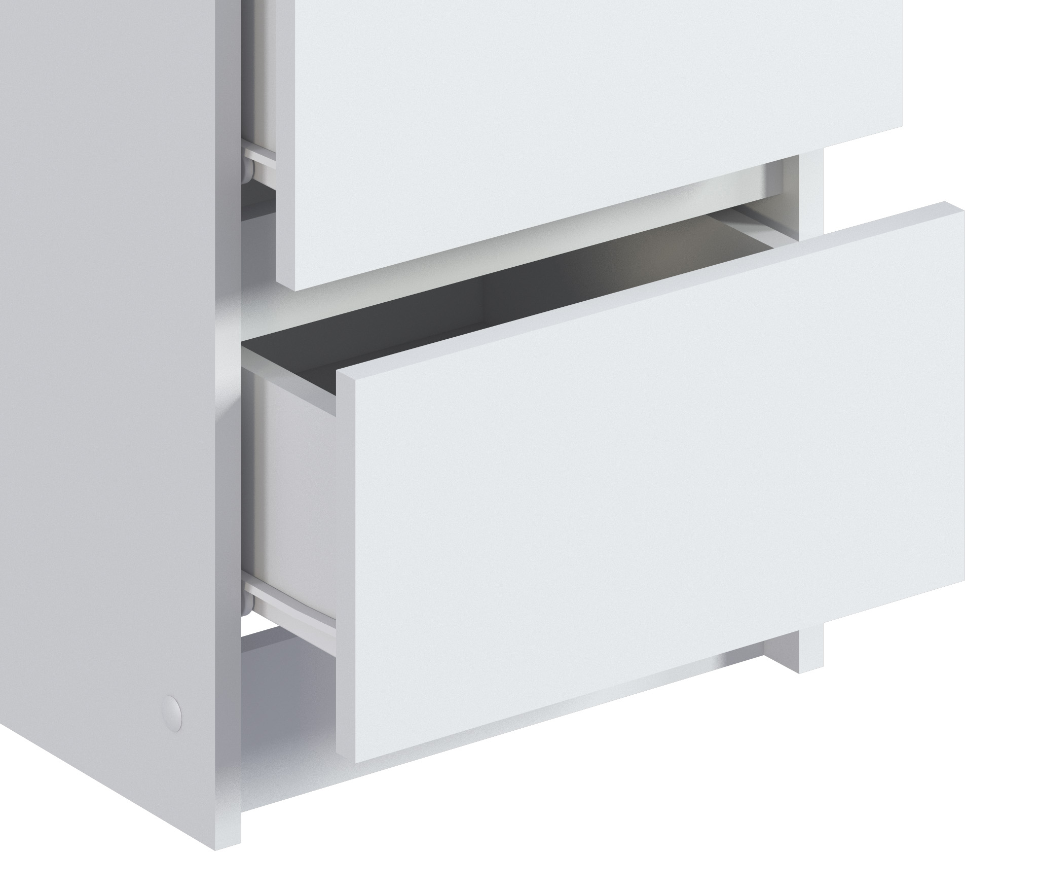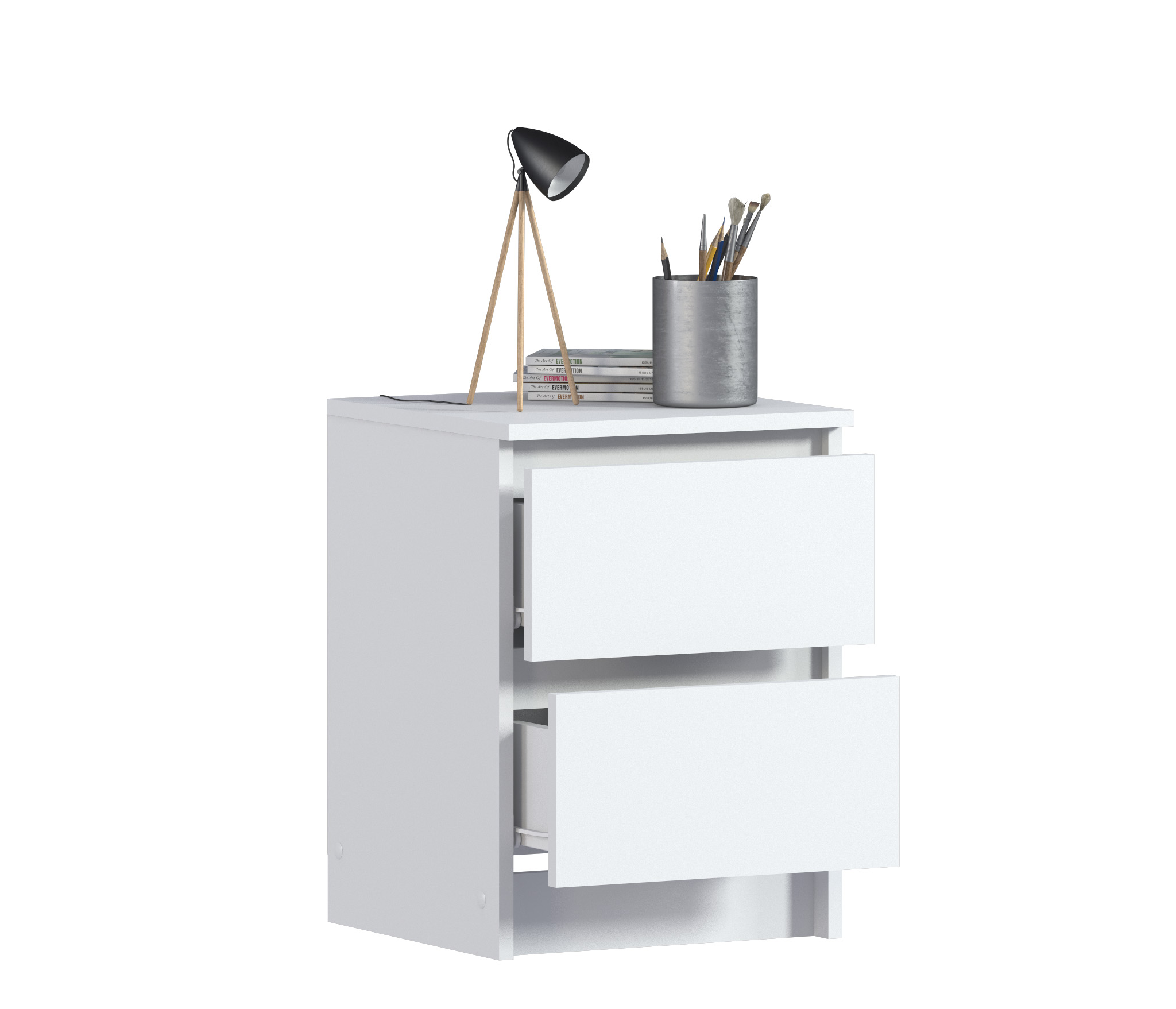 Габаритные размеры тумбы довольно компактны - ширина 39 см, высота 53 см, глубина 39 см. Под столешницей расположены два ящика, оснащенных прочными выдвижными механизмами. Тумба идеально подойдет для оформления вашей спальни или детской в современном стиле. Тумба выполнена из прочного современного КДСП.