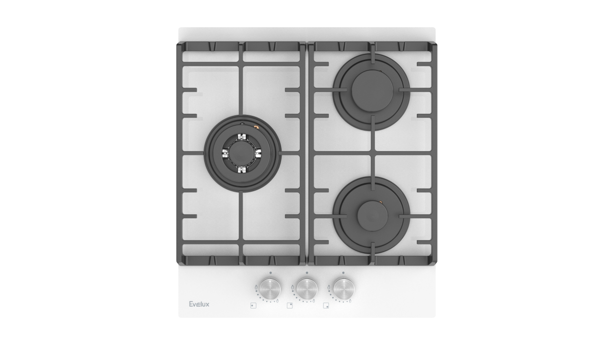 Варочная панель газовая, 45 см, 3 конфорки: экономичная конфорка (0,9 кВт), стандартная конфорка (1,7 кВт), ВОК конфорка (2,5 кВт), газ-контроль, электроподжиг, белое высокопрочное закаленное стекло, чугунные решетки, поворотные переключатели, комплект форсунок-переходников на балонный газ, 460х515х120 мм.