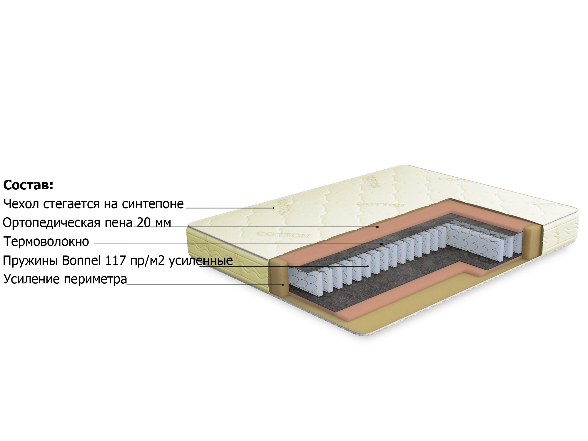 Матрас высокой жесткости с усиленным пружинным блоком Боннель . Усиление достигается за счет вставок из пенополиуретана. Данный матрас рекомендуется для людей с повышенной массой тела.