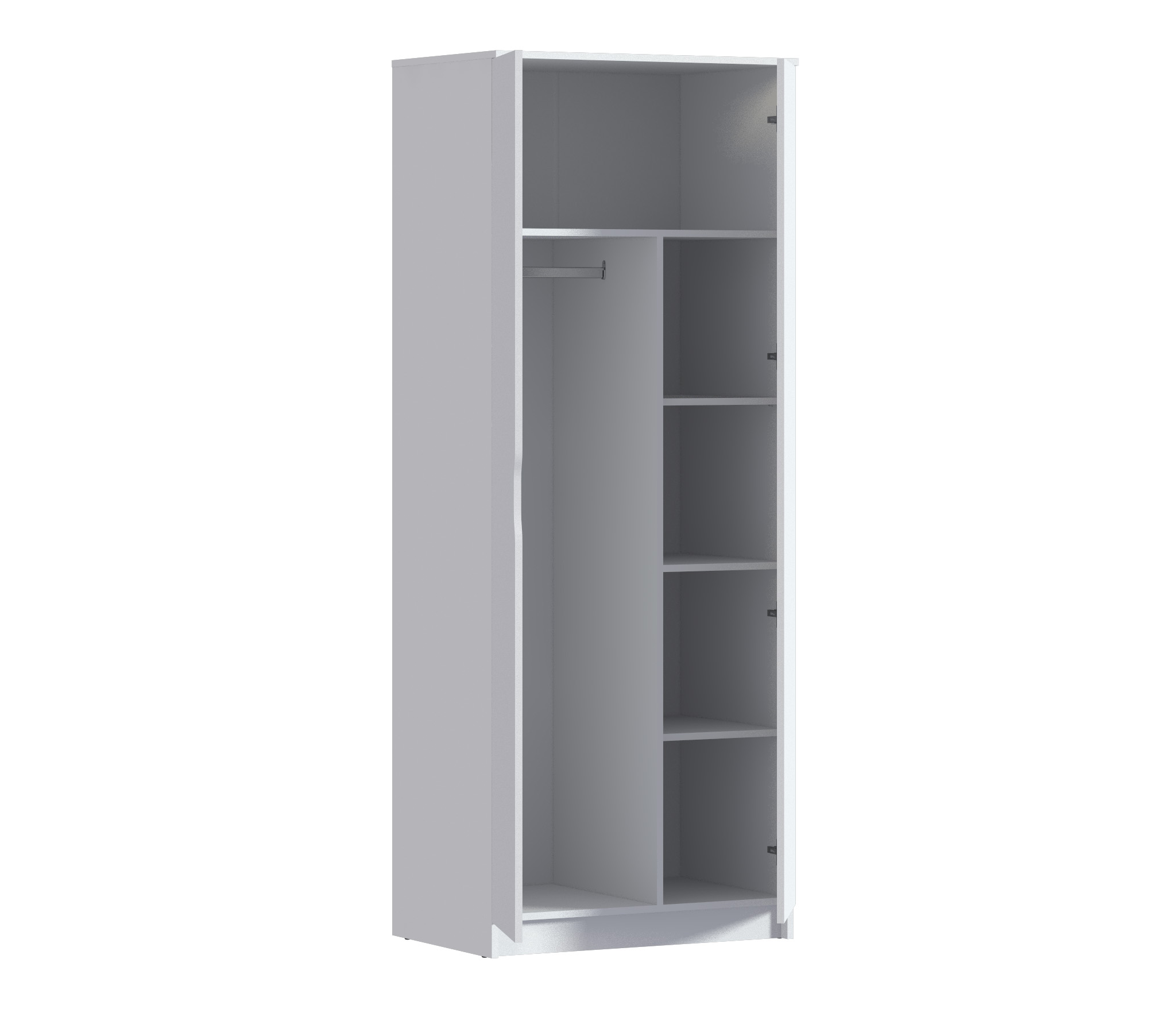 Внутри шкафа расположены четыре полки, на которых вы можете разместить свою одежду, аксессуары и другие предметы. Они обеспечивают удобную организацию и доступ к вещам.
