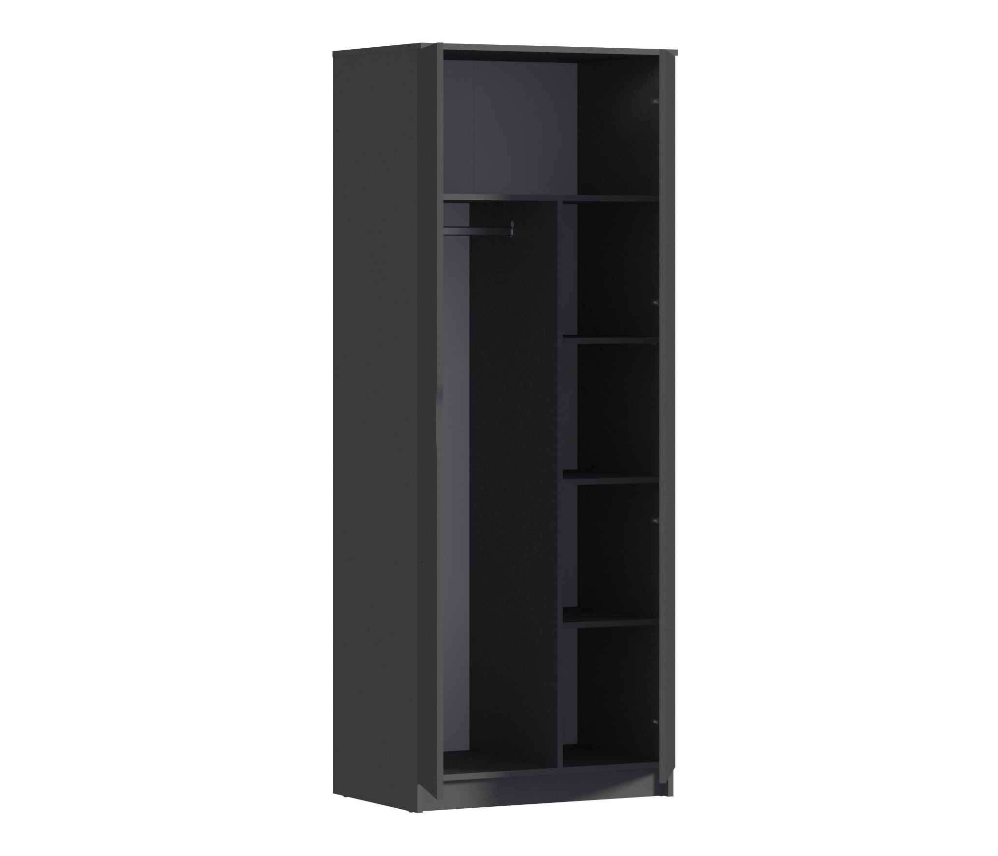 Внутри шкафа расположены четыре полки, на которых вы можете разместить свою одежду, аксессуары и другие предметы. Они обеспечивают удобную организацию и доступ к вещам.