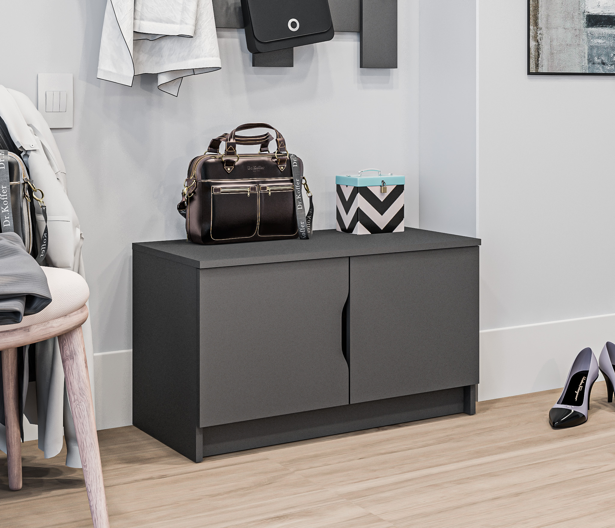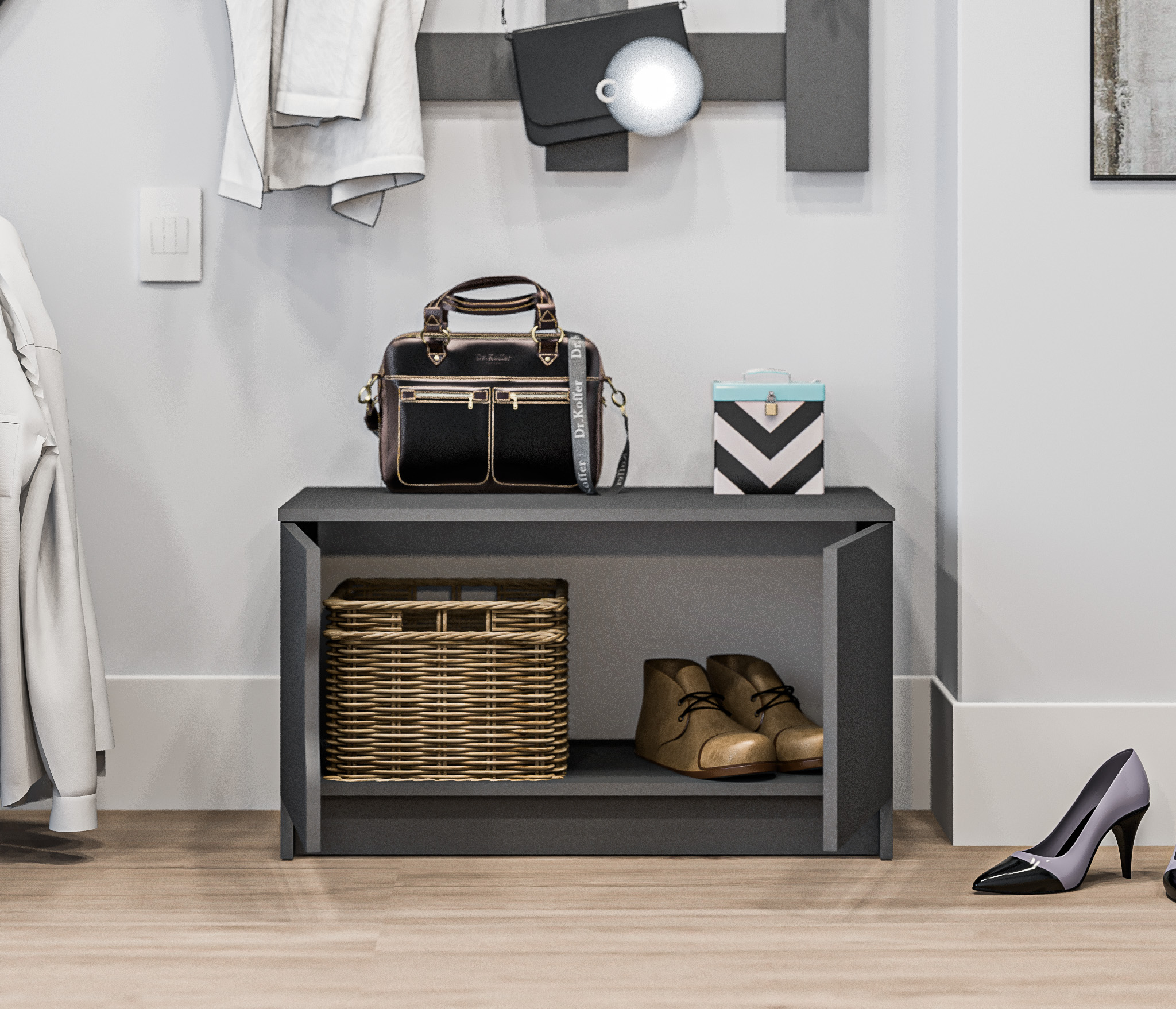 Тумба предлагает удобное хранение и функциональность. Она оснащена двумя дверцами, вы можете хранить обувь, аксессуары и другие предметы, необходимые в прихожей.