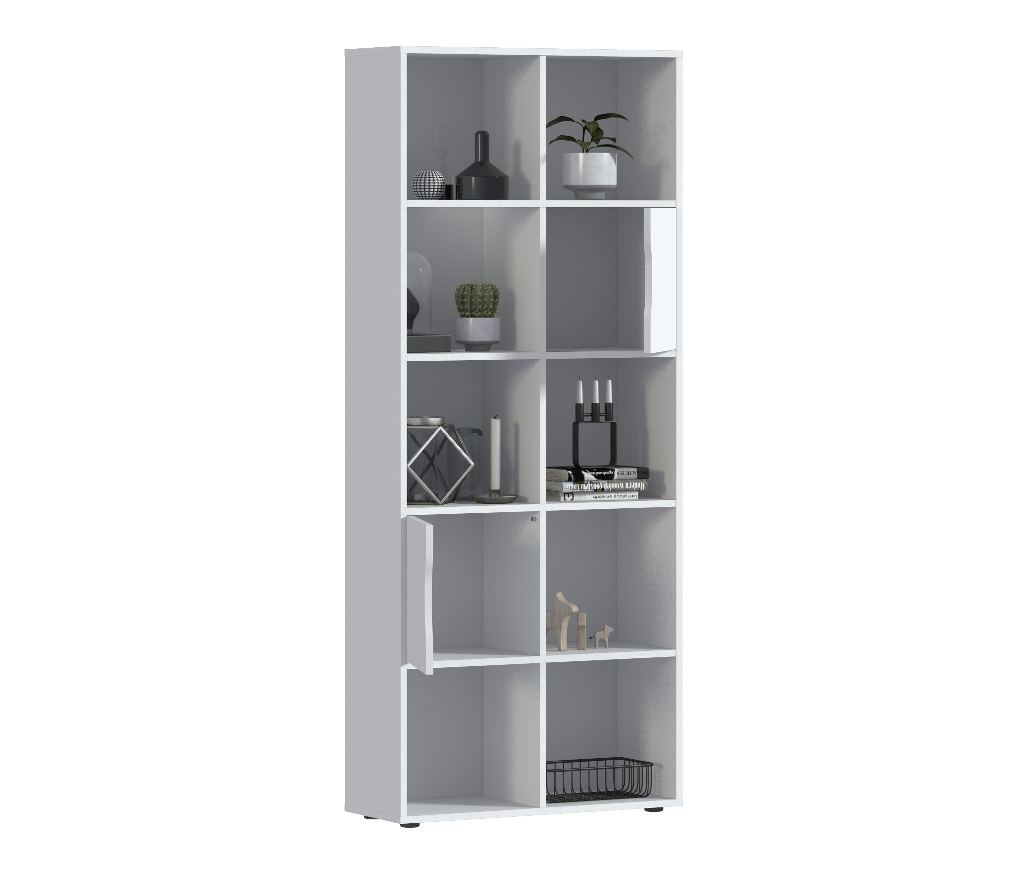 Стеллаж состоит из пяти ярусов и десяти полок, предлагая достаточно места для размещения книг, декоративных предметов, файлов и других вещей. Из этих десяти полок две закрыты дверцами, что позволяет вам хранить предметы вне прямого обзора и обеспечивает защиту от пыли и внешних воздействий.
