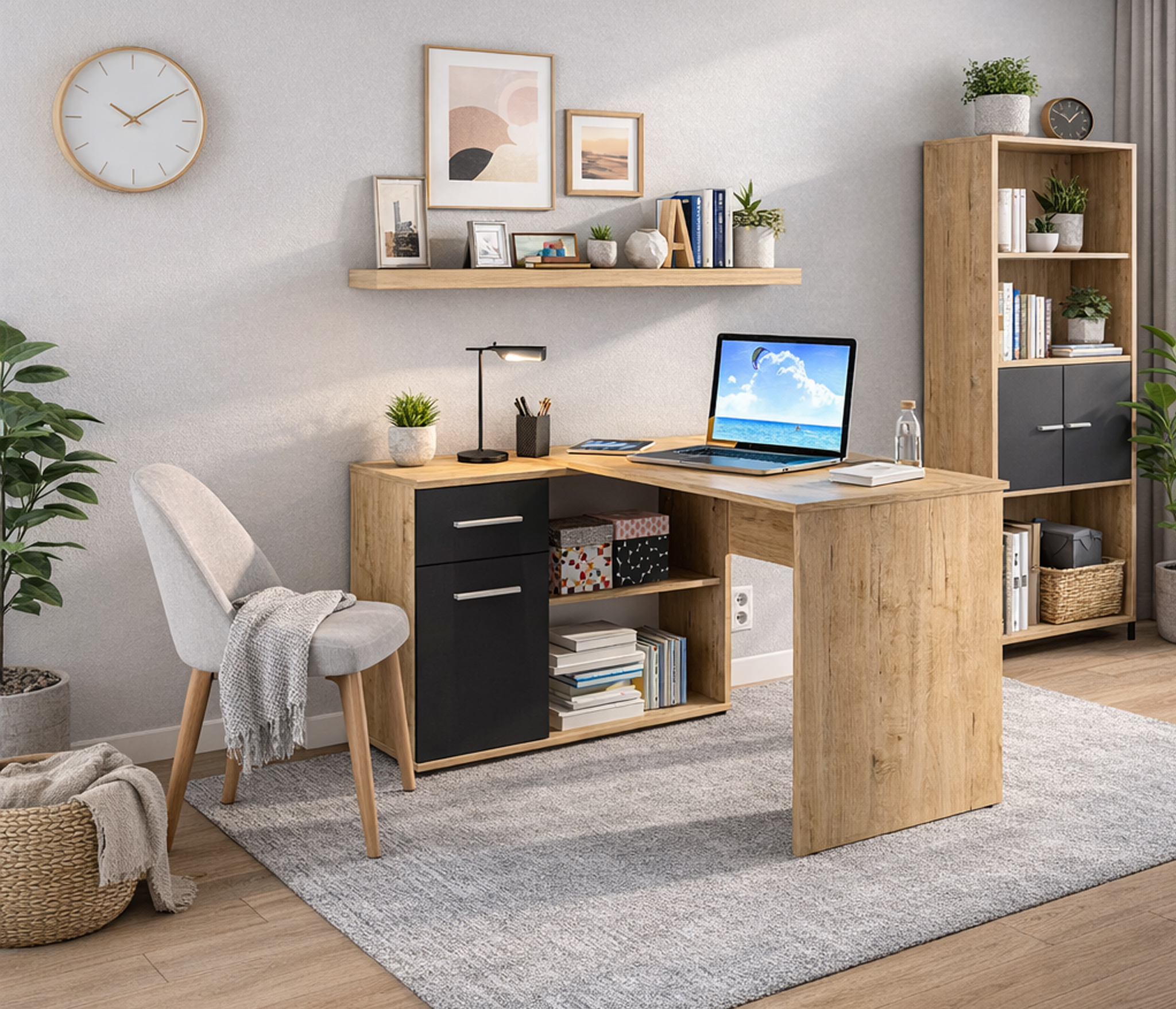 Размеры стола составляют 750 мм в высоту, 1190 мм в ширину и 800 мм в глубину, обеспечивая достаточно места для комфортной работы. Благодаря угловому дизайну, стол эффективно использует пространство и идеально вписывается в угол комнаты.