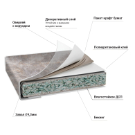 Основа – влагостойкое ДСП, толщиной 38 мм. Пластик толщиной 04-0,5 мм. Задний срез обработан меламиновой кромкой. Низ закрыт защитным покрытием бэкинг, которое защищает ДСП от влаги. Столешница оснащена уникальным каплесборником (специальная силиконовая накладка, монтируемая в паз на передней части столешницы снизу). Препятствует стеканию капель воды со столешницы на фасады и встроенную техник, расположен под углом 12,7 гр. Произведена на полностью автоматизированном немецком оборудовании. Поставляется в упаковке.