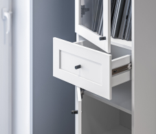 Продуманные детали делают использование стеллажа максимально удобным: шариковые направляющие обеспечивают плавное выдвижение ящика.